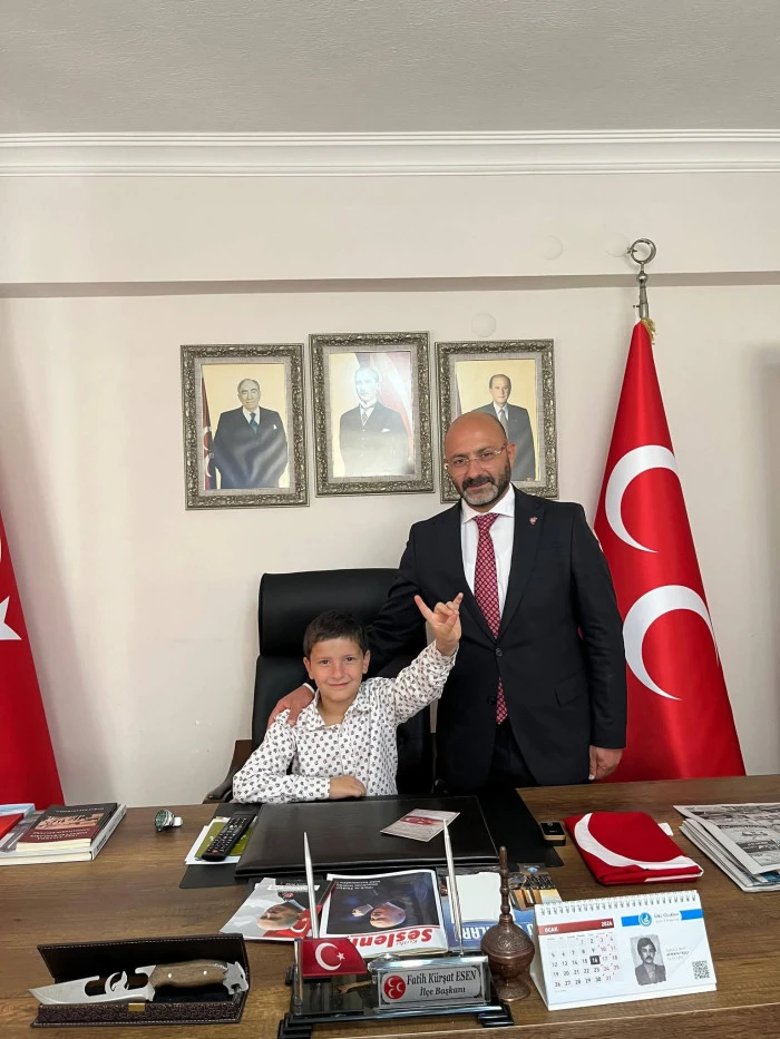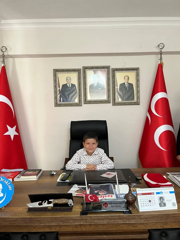 Milliyetçi Hareket Partisi Didim İlçe Başkanı Kürşat Fatih Esen, 23 Nisan Ulusal Egemenlik ve Çocuk Bayramında Başkanlık koltuğunu oğlu Hüseyin Alp Esen'e bıraktı.