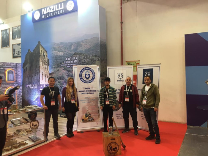 Üniversitemizi temsilen İnsan ve Toplum Bilimleri Fakültesi Arkeoloji Bölümü Öğretim Üyesi Doç. Dr. Sedat Akkurnaz ve bölüm öğrencileri Caner Sağ, Fatma Yağmur Gündoğdu ile Didim Meslek Yüksekokulu Öğr. Gör. Aytekin Kalkan ve Öğr. Gör. Eren Gönül’ün yer aldığı fuarda; Nazilli standı kurularak ilçenin arkeolojik, tarihi, kültürel ve turistik yerleri tanıtıldı. Üniversitemiz tarafından kazısı yapılan Mastaura Antik Kenti ile Arpaz Beyler Konağı gibi tarihi ve turistik yerler hakkında bilgiler verildi. Zeytinyağı, incir, nar ekşisinin ön plana çıkarıldığı stantta; yöresel ürünlerle hazırlanan lezzetler ikram edilirken, Sümer Kampüsü’nde hazırlanan ve Sümerbank Basma Fabrikası’nın motiflerinden üretilen eşyalar ziyaretçilere hediye edildi.