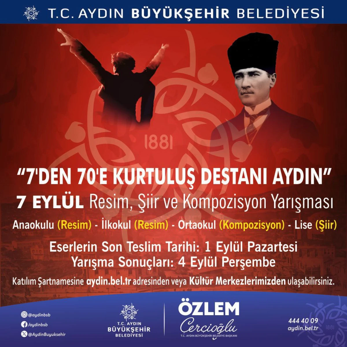 Aydın Büyükşehir Belediye Başkanı Özlem Çerçioğlu, Aydın’ın düşman işgalinden kurtuluşunun yıldönümünde “7’den 70’e Kurtuluş Destanı Aydın” temalı ödüllü resim, şiir ve kompozisyon yarışmasıyla öğrencileri coşkuya ortak olmaya davet ediyor.