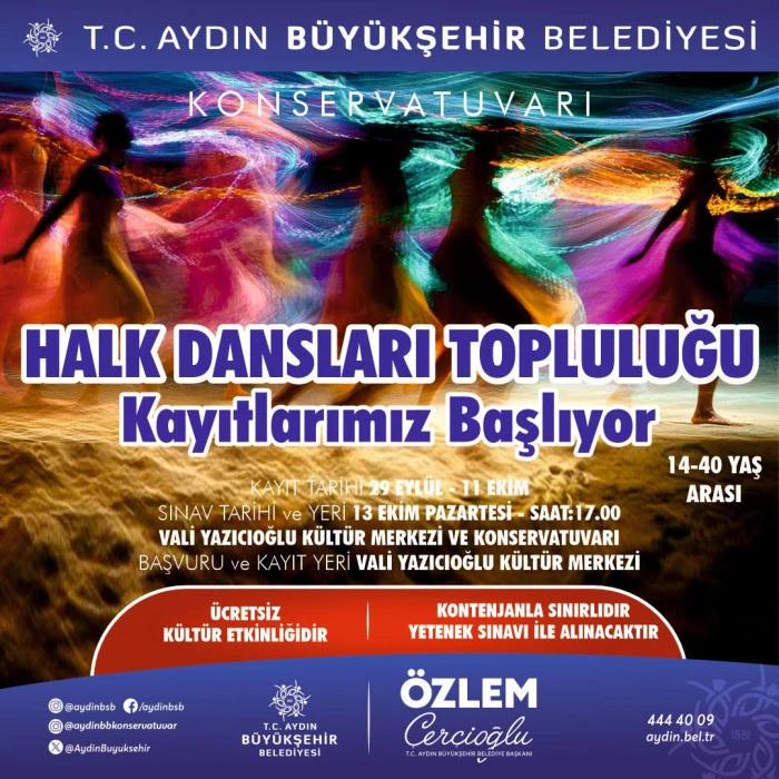 Aydın Büyükşehir Belediyesi Konservatuarı, kültür ve sanat alanındaki çalışmaları ile kapılarını bir kez daha Aydınlılar için açıyor. Çocuk Halk Oyunları ile Halk Dansları Topluluğu eğitimleri için kayıt dönemi başlıyor.