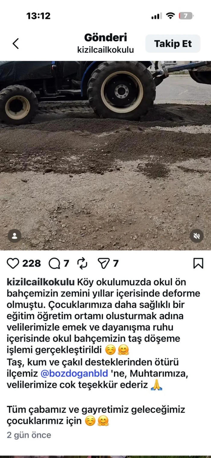 “Köy okulumuzda okul ön bahçemizin zemini yıllar içerisinde deforme olmuştu. Çocuklarımıza daha sağlıklı bir eğitim öğretim ortamı oluşturmak adına velilerimizle emek ve dayanışma ruhu içerisinde okul bahçemizin taş döşeme işlemi gerçekleştirildi. Taş, kum ve çakıl desteklerinden ötürü ilçemiz Bozdoğan Belediyesi’ne, muhtarımıza ve velilerimize çok teşekkür ederiz. Tüm çabamız ve gayretimiz geleceğimiz çocuklarımız için” ifadelerine yer verildi.