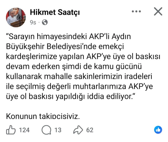 Saatçı, Aydın Büyükşehir Belediyesi’nde çalışan emekçilere AK Parti’ye üye olmaları yönünde baskı yapıldığını, şimdi ise aynı baskının muhtarlara da uygulandığını öne sürdü. Kamu gücünün kullanıldığı iddialarına dikkat çeken Saatçı, paylaşımında şu ifadelere yer verdi:
