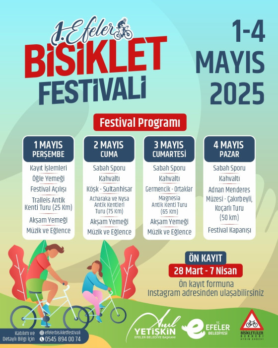 Efeler Bisiklet Festivali’ne katılmak isteyenler için ön kayıt süreci 28 Mart – 7 Nisan tarihleri arasında gerçekleştirilecek. Festival programı ve kayıt süreciyle ilgili detaylı bilgi almak isteyenler, 0545 894 00 74 numaralı telefondan yetkililere ulaşarak gerekli bilgilere erişebilecek. Yoğun ilgi görmesi beklenen festivale katılım için ön kayıt yaptırmak büyük önem taşıyor.